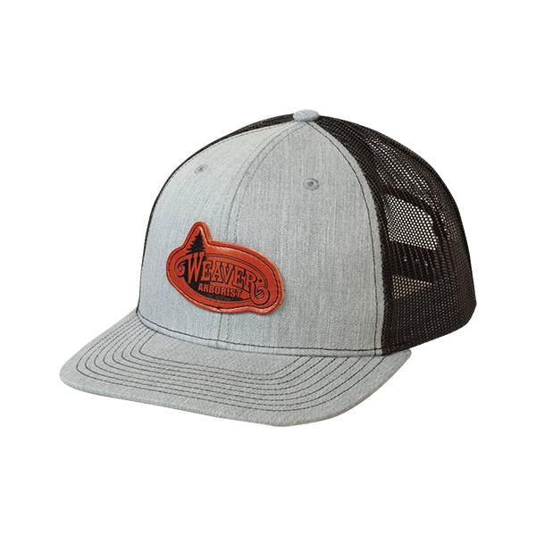 Leather patch featuring the Weaver Arborist logo adds a touch of style to this comfortable gray cap with black mesh back