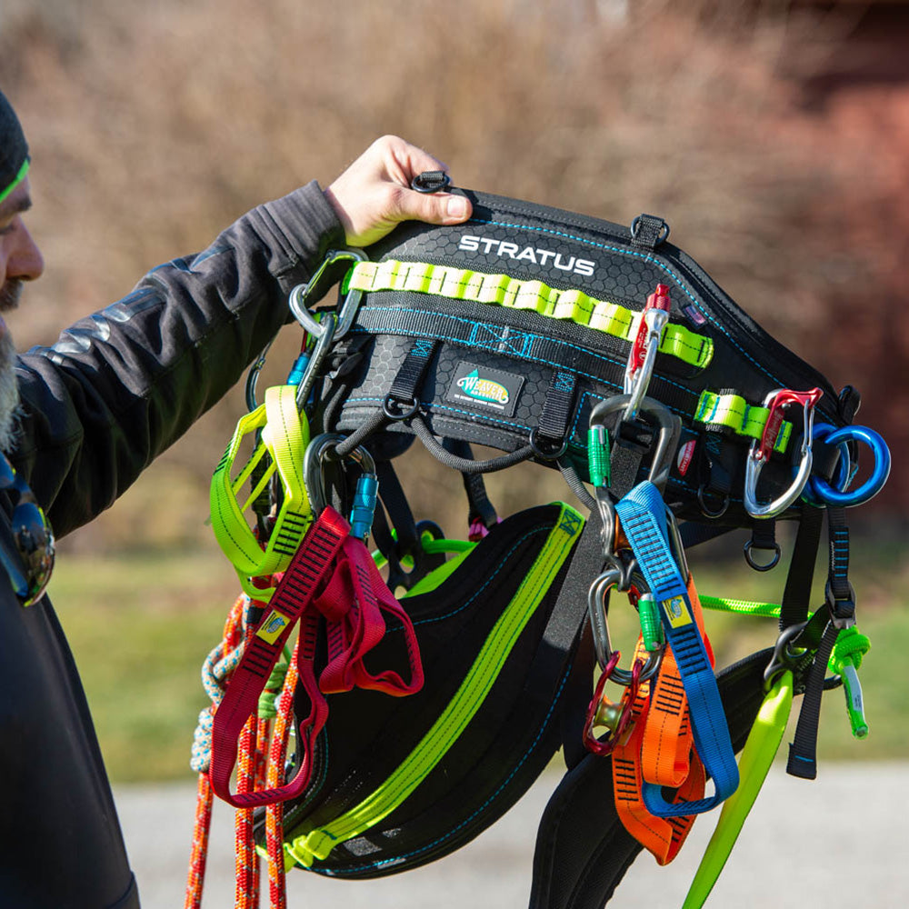- Lightweight, durable aluminum hip dees and rigging plates provide multiple attachment points on this climbing harness, giving added flexibility to arborists